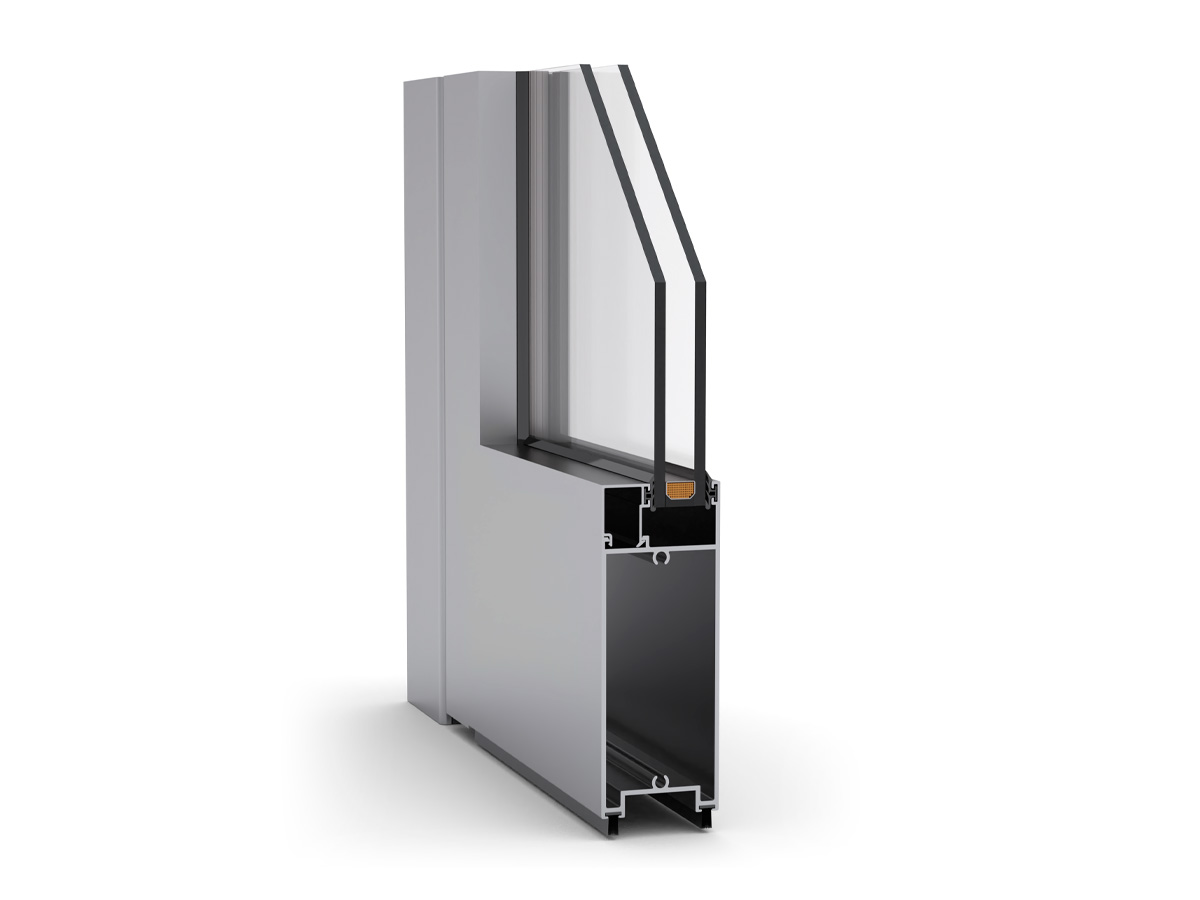Puerta peatonal coplanar sin rotura de puente térmico para locales comerciales y edificios, los perfiles de cerco y hoja tienen una profundidad de 53 mm. Dicho sistema posibilita aperturas practicables de una y dos hojas, tanto al interior como al exterior, pudiéndose realizar múltiples composiciones de puertas y fijos.